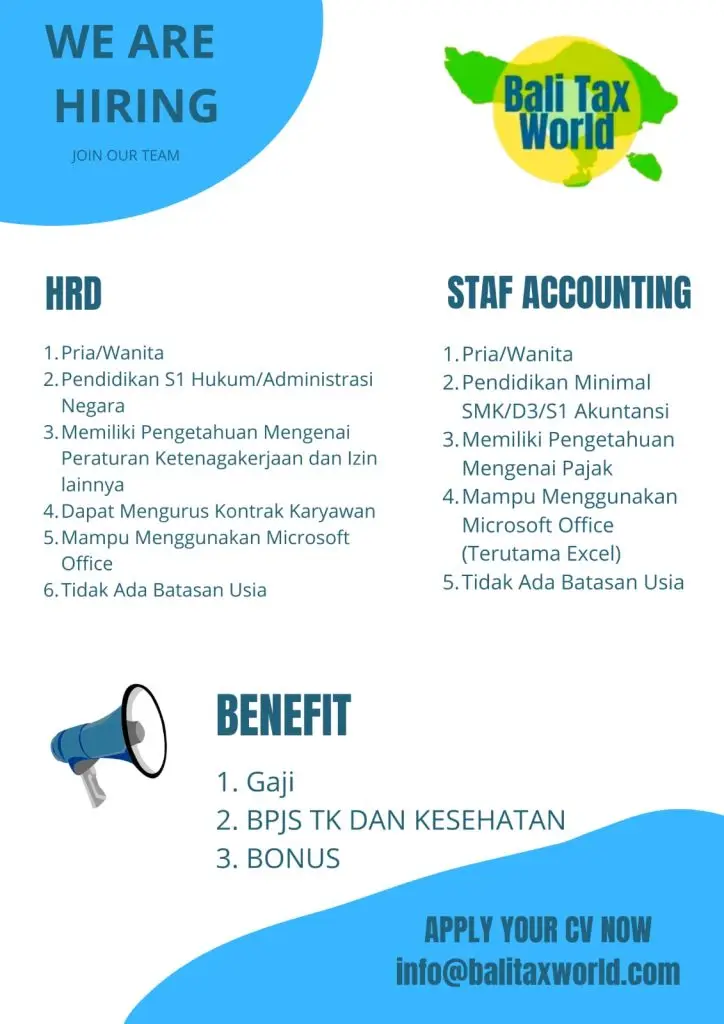 Staf AccountingBy admin / May 15, 2025 Kualifikasi: Pria / Wanita Pendidikan minimal SMK / D3 / S1 Akuntansi Memiliki pengetahuan mengenai Pajak Mampu menggunakan Microsoft Office (terutama Excel) Tidak ada batasan usia Benefit: Gaji BPJS TK dan Kesehatan Bonus Apply for this position Full Name *Email *Phone *Cover Letter *Upload CV/Resume *Allowed Type(s): .pdf, .docxBy using this form you agree with the storage and handling of your data by this website. *